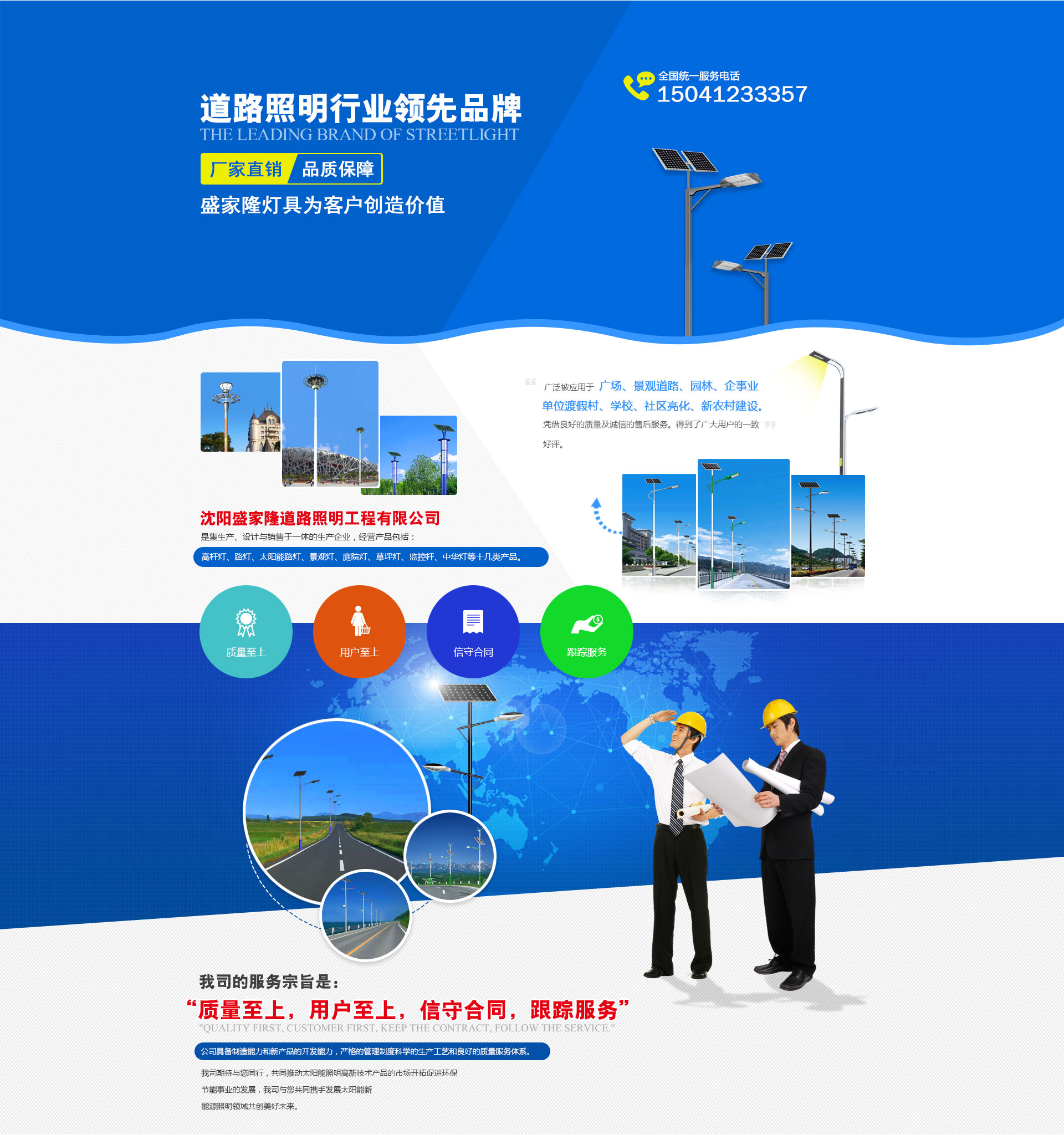 沈陽(yáng)盛家隆道路照明工程有限公司坐落于沈陽(yáng)市于洪區(qū)興盛村愛(ài)國(guó),生產(chǎn)各種室外,道路,廣場(chǎng),車(chē)站,碼頭,橋梁,庭院及室內(nèi)工礦照明燈具,品種有太陽(yáng)能路燈,道路燈,LED路燈,組合燈,景觀(guān)燈,庭院燈,草坪燈,彩色泛光燈,中高桿燈以及配套使用的各種路燈頭,鎮(zhèn)流器,觸發(fā)器開(kāi)關(guān)箱等系列產(chǎn)品。 本公司自成立以來(lái),已初具規(guī)模,現(xiàn)有高級(jí)技術(shù)人員5人,中級(jí)技術(shù)人員28人,研究設(shè)計(jì)人員14人,車(chē)間工人百余人,并備有大型斬彎?rùn)C(jī),1600t-900t壓鑄機(jī),20t行吊,高速縱剪機(jī),埋弧自動(dòng)焊,彩色噴塑線(xiàn)燈先進(jìn)設(shè)備,高科技創(chuàng)造高質(zhì)量,由我公司生產(chǎn)的各種類(lèi)型的照明燈具,不僅質(zhì)量可靠而且線(xiàn)條流暢,外形美觀(guān),深受廣大客戶(hù)的喜愛(ài),長(zhǎng)期以來(lái),我公司一直注重產(chǎn)品質(zhì)量,堅(jiān)持“質(zhì)量是企業(yè)的生命”的宗旨。由于質(zhì)量可靠,價(jià)格合理,服務(wù)周到,從而贏(yíng)得了廣泛的市場(chǎng)聲譽(yù)。企業(yè)先后被評(píng)為“質(zhì)量信得過(guò)企業(yè)”“重誠(chéng)信守信用企業(yè)”,“AAA級(jí)資信企業(yè)”,并通過(guò)ISO9001:2000國(guó)際質(zhì)量體系認(rèn)證,ISO14001:2004環(huán)境管理體系認(rèn)證,CCC,CQC國(guó)家強(qiáng)制性產(chǎn)品認(rèn)證和持有道路照明二級(jí)安裝,安全生產(chǎn)資質(zhì)。